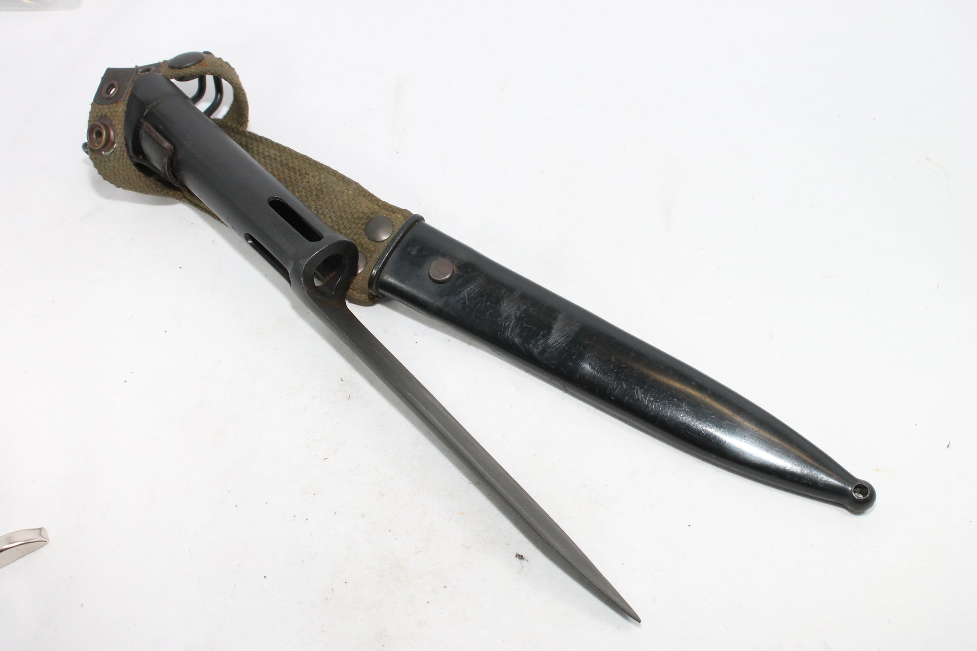 De FAL bajonet in goede staat met de schede met de amerikaanse stijl koppeling. Groene frog en de schede is van kunststof gemaakt.