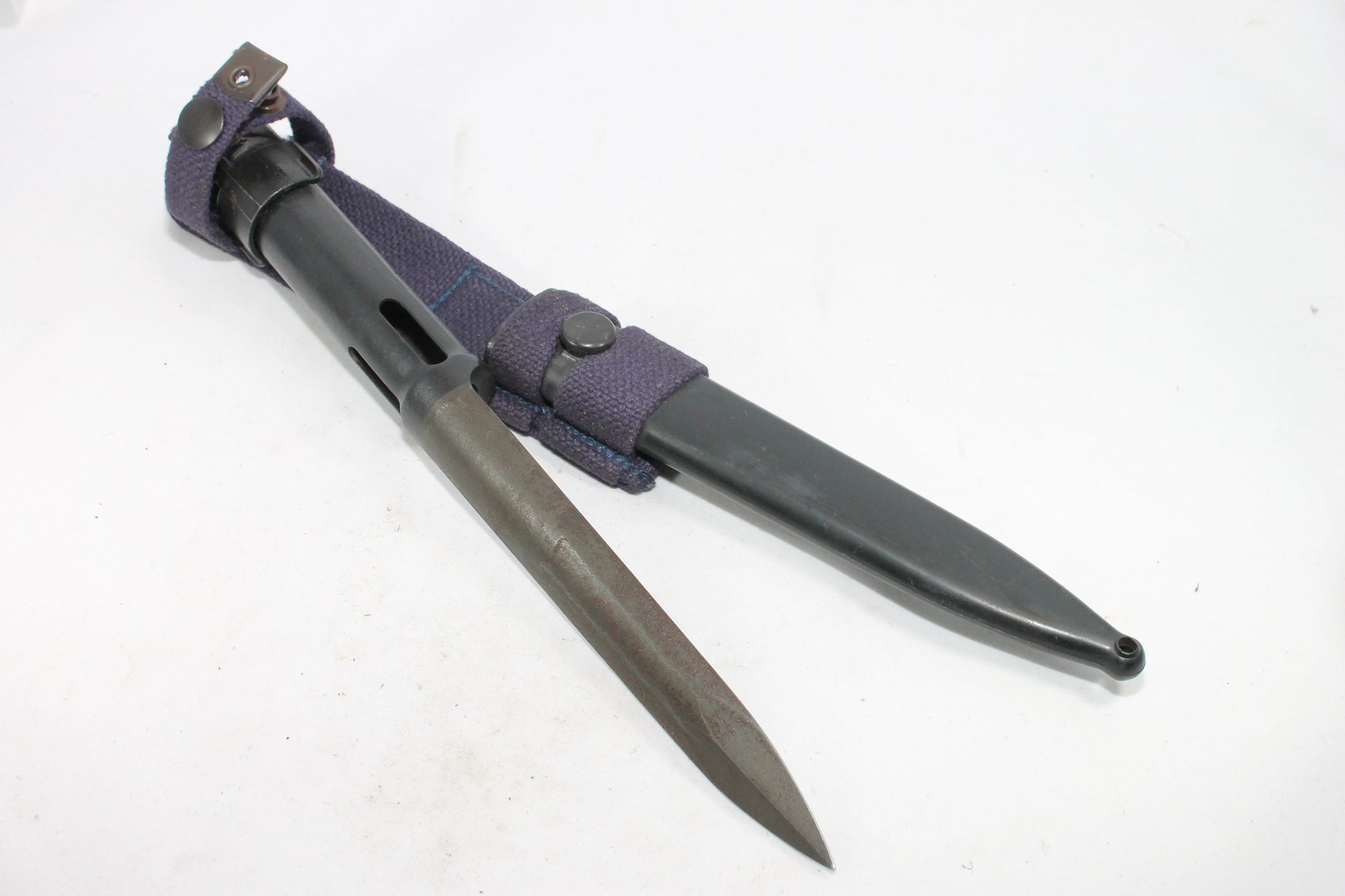 Een niet alledaagse FAL bajonet type C met de blauze frog die niet vastgeklinkt zit aan de schede maar het engelse model heeft.