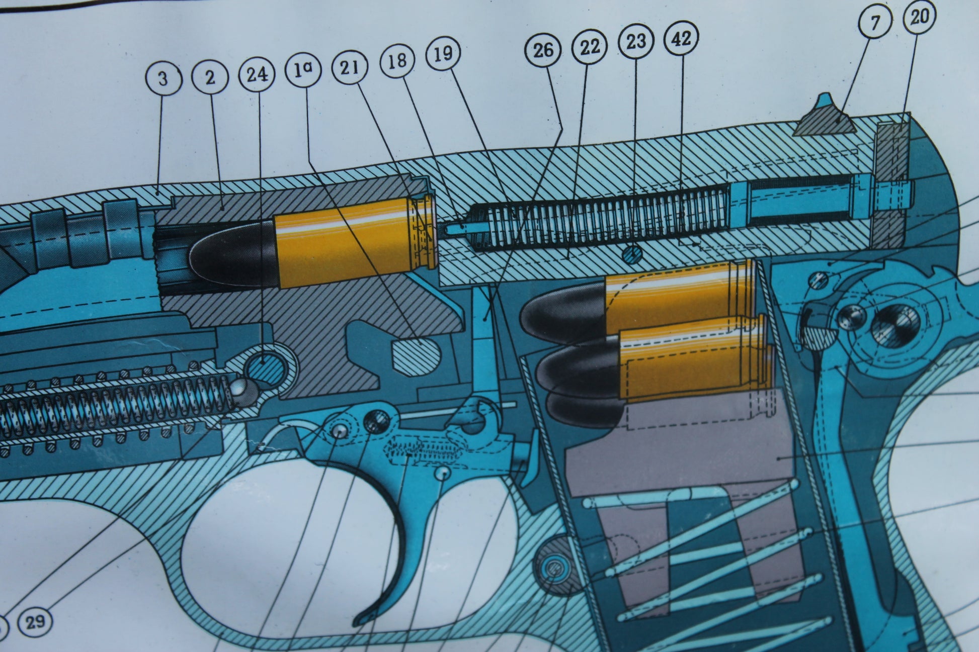 Zeer bijzondere en zeldzame FN instructie poster, klein model, voor de FN High Power. Ondanks de ouderdom in zeer goede staat.
