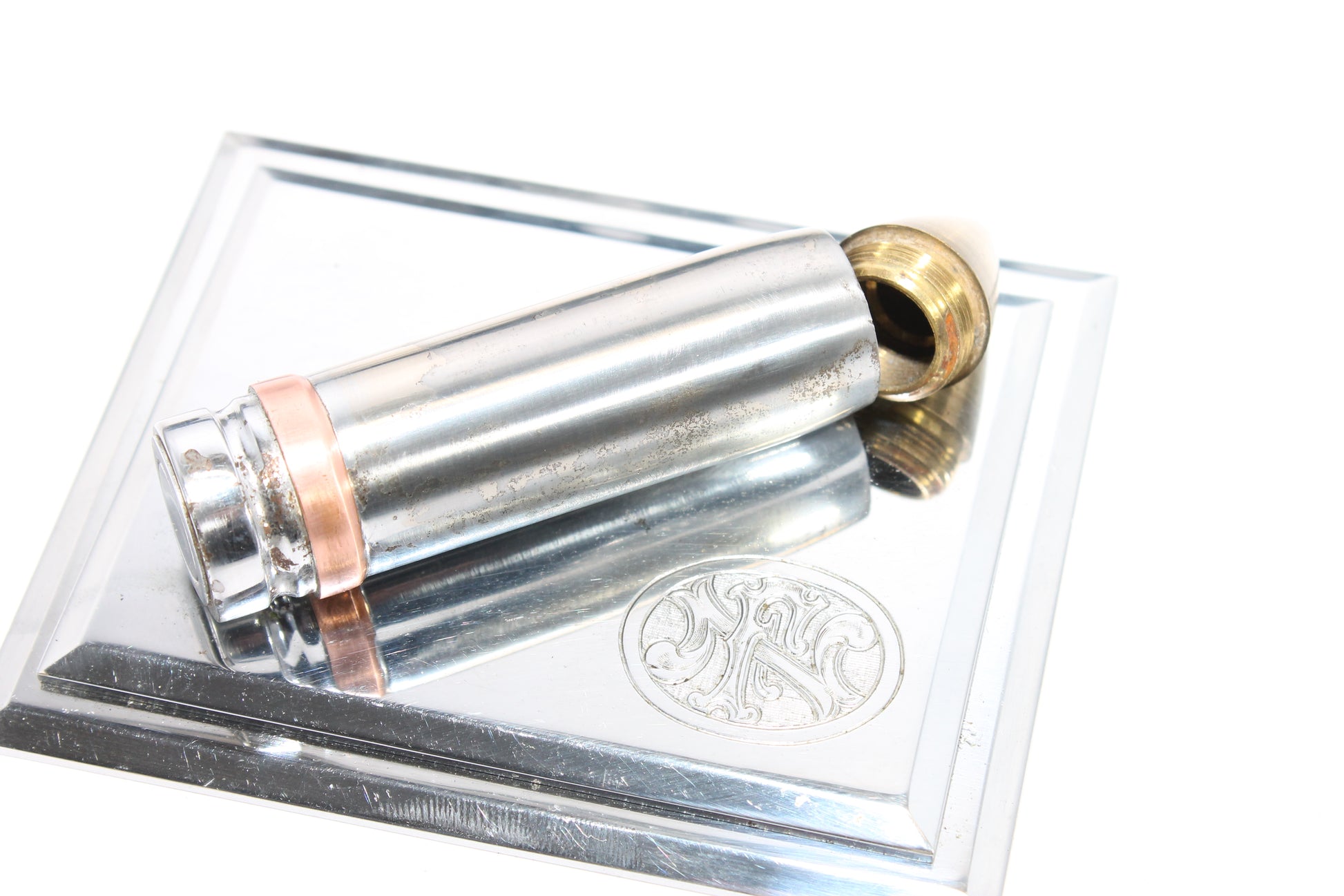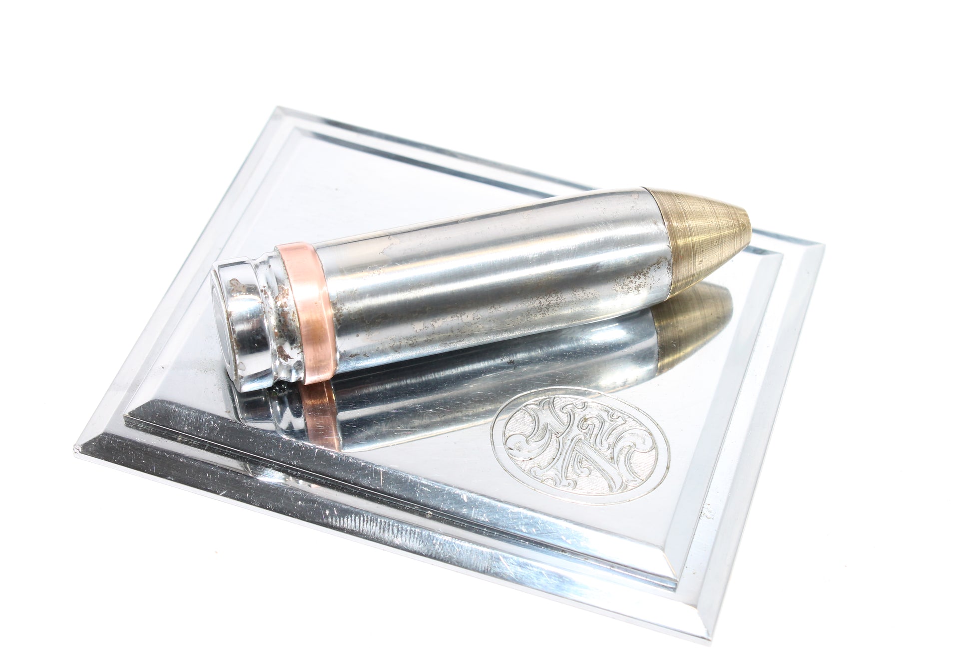 Een originele FN presse papier van metaal vervaardigd. De punt van de kogel kan afgeschroefd worden voor een kleine bergplaats. Door de gaten voor de bevestiging en de holle ruimte volledig inert. Volledig demonteerbaar. Gemaakt door FN zelf.