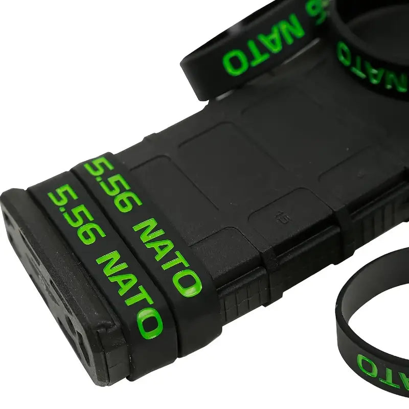 Een heel duidelijke manier om de magazijnen met verschillende kalibers snel te markeren. Eenvoudig aanbrengen en verwijderen van de rubbereb band.