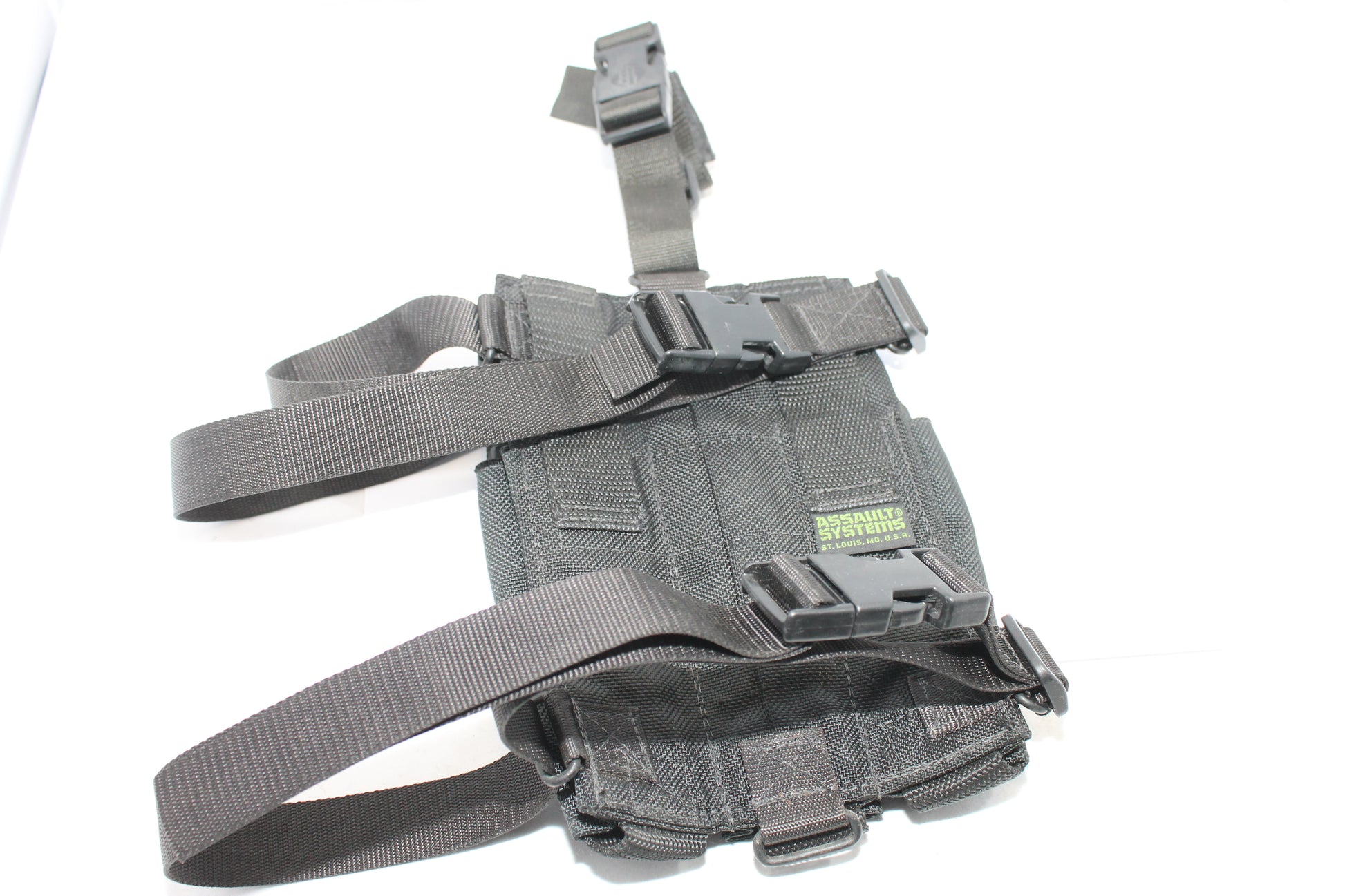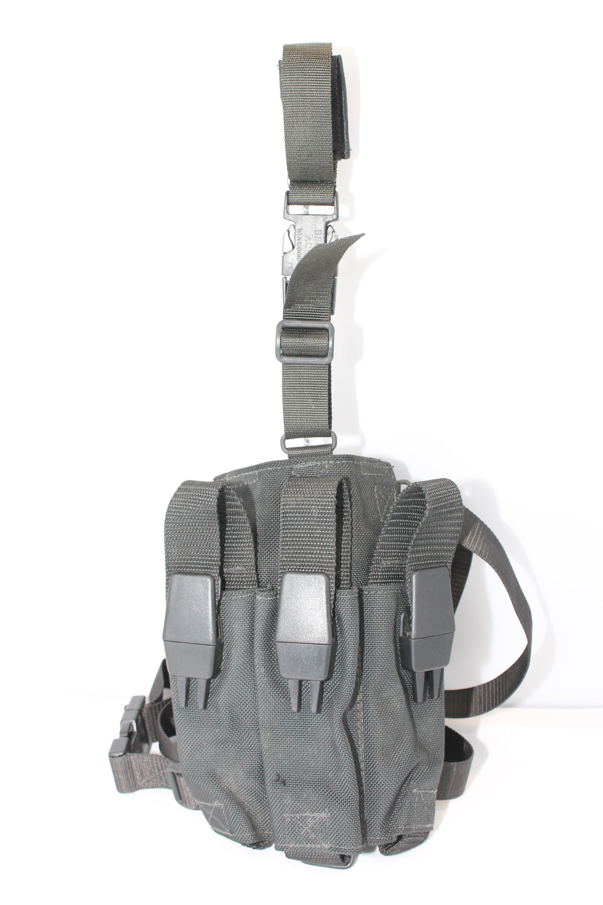 Zeer stevig maar ook licht van gewicht bovenbeen houder voor drie 9mm magazijenne, lang model zoals van SMG of verlengede pistool magazijnen. Met een of twee riemen aan het bovenbeen te bevestigen voor weinig beweging, ook tijdens het hardlopen en of klimmen. Verbindingstuk voor de riem met snelkoppeling.