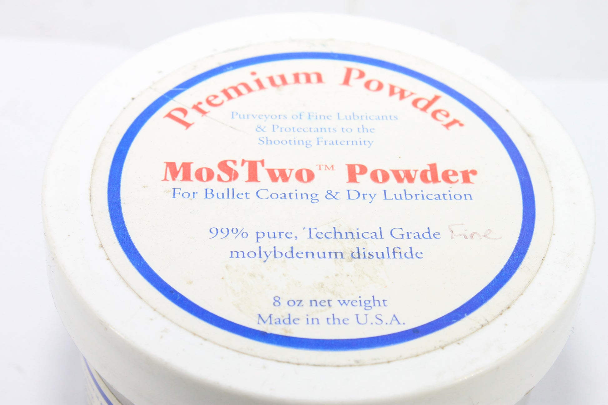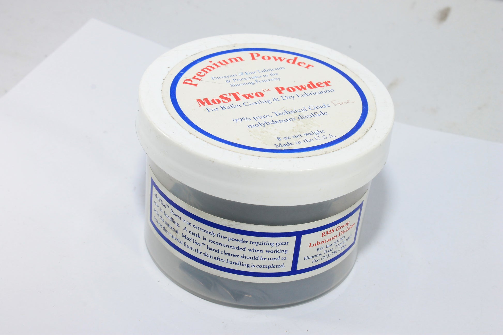 Een pot met molycoat poeder voor de precizie lange afstandschutters die zelf molycoaten. Een klein beetje toevoegen aan de gereinigde hulzen in de tuimelaar. Niet vergeten keramische "hamertjes" toe te voegen om een mooie gelijkmatige coating van de kogelkoppen te krijgen.