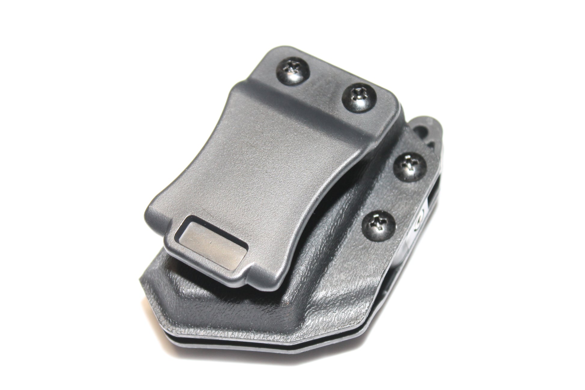 Een zeer compacte en gemakkelijk verdekt te dragen magazijn houder. Bedoeld voor double stack 9mm magazijnen zoals van S&W, Glock, SIG, H&K etc. De klemkracht is eenvoudig te regelen met een inbus sleutel die erbij wordt geleverd. Stevig Kydex materiaal blijft ook open staan wanneer IWB gedragen wordt. De riemclip kan verwisseld worden zodat deze pouch zowel door rechtshandigen als door linkshandigen gebruikt kan worden.