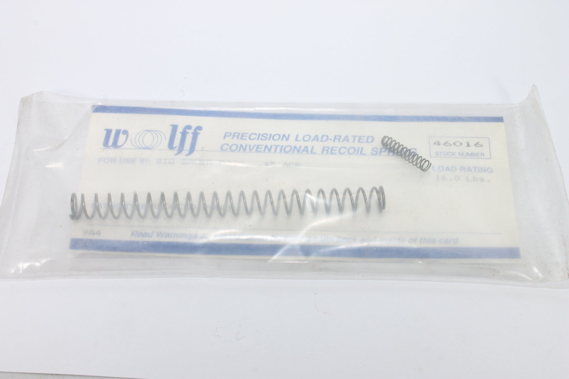 Wolff SIG-220, kaliber .45 ACP, precision load rated conventional recoil spring 16.0 Lbs. Een extra power slagpin veer is inclusief.